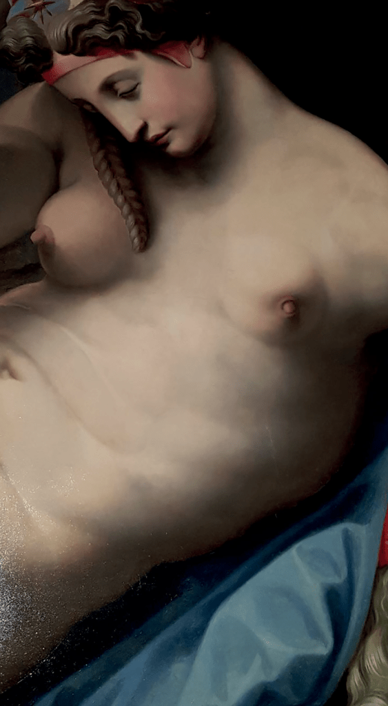 “La notte” è un olio su pannello ed è la trasposizione pittorica dell’omonima statua scolpita in marmo (1526-1531, Chiesa di San Lorenzo in Firenze; Fig. 3 e copertina) da Michelangelo Buonarroti (1475-1564). Una prima proposta di diagnosi relativa ad un tumore nella mammella sinistra della statua di Michelangelo era stata precedentemente fatta sulla base del capezzolo scolpito in modo anormale. Tuttavia, grazie all’uso di diversi pigmenti nel dipinto, si possono apprezzare ulteriori dettagli nella figura femminile raffigurata, alcuni dei quali non sono visibili nella statua del Buonarroti, e quindi la rappresentazione del colore aiuta a rafforzare la diagnosi proposta. Il dipinto rivela la presenza di un grande rigonfiamento mediale al capezzolo, una regione irritata che circonda il complesso areola-capezzolo, una retrazione quasi completa del capezzolo e una riduzione consistente della dimensione dell’intero seno sinistro (Fig. 1, immagine ravvicinata). Al contrario, nella statua è possibile osservare solo un minimo grado di retrazione del capezzolo (Fig. 3, immagine ravvicinata). Il seno destro sembra essere normale in entrambe le rappresentazioni. Sulla base dei dettagli raffigurati nel dipinto, i ricercatori hanno proposto una diagnosi di neoplasia maligna nella regione centrale del seno sinistro con progressiva retrazione del capezzolo.
