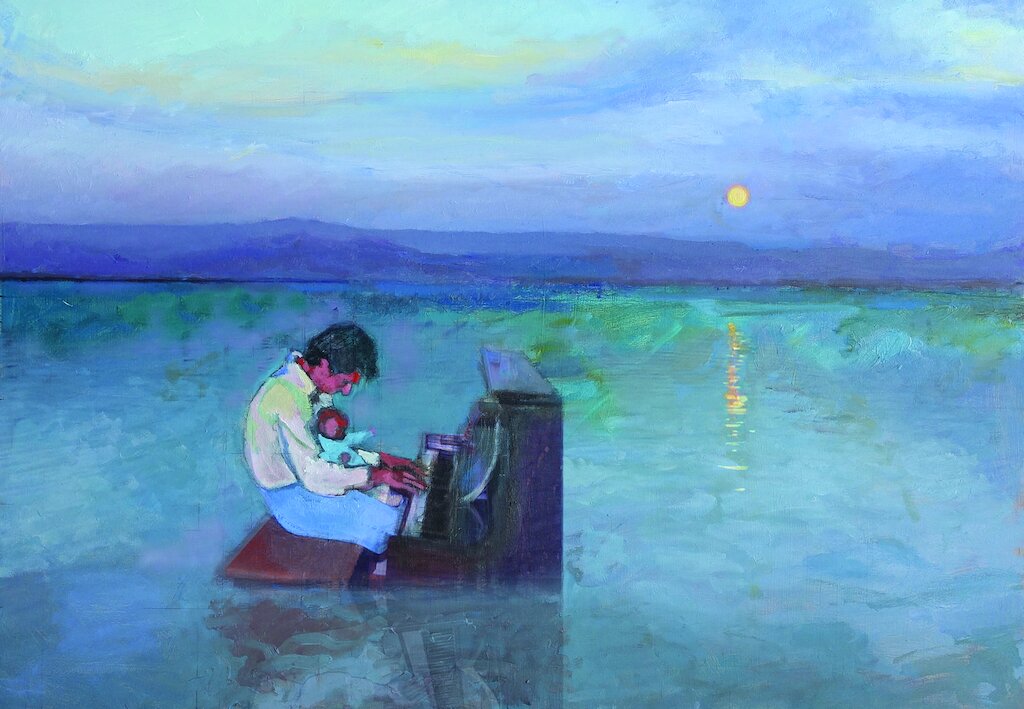 Inondato dal blu che collega il cielo con il paesaggio e l’acqua, il padre al pianoforte culla in grembo la sua bambina mentre le suona una melodia alla luce della luna argentea. Conservati sulla tela, padre e figlia risiedono insieme in quello che Freud definiva “sentimento oceanico”: il senso di illimitatezza, di essere fusi l’uno con l’altro e con il mondo esterno. “Si dice che nessuno possa annegare nel Mar Morto a causa del suo alto contenuto di sale – commenta l’artista –, anche se è impossibile non prevedere che il pianista e la sua bambina fasciata affondino nelle profondità insondabili della memoria”.